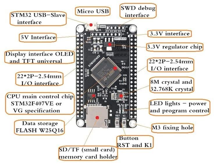 - Microcontrôleur : STM32F407VGT6 avec cœur ARM® 32 bits Cortex®-M4 FPU